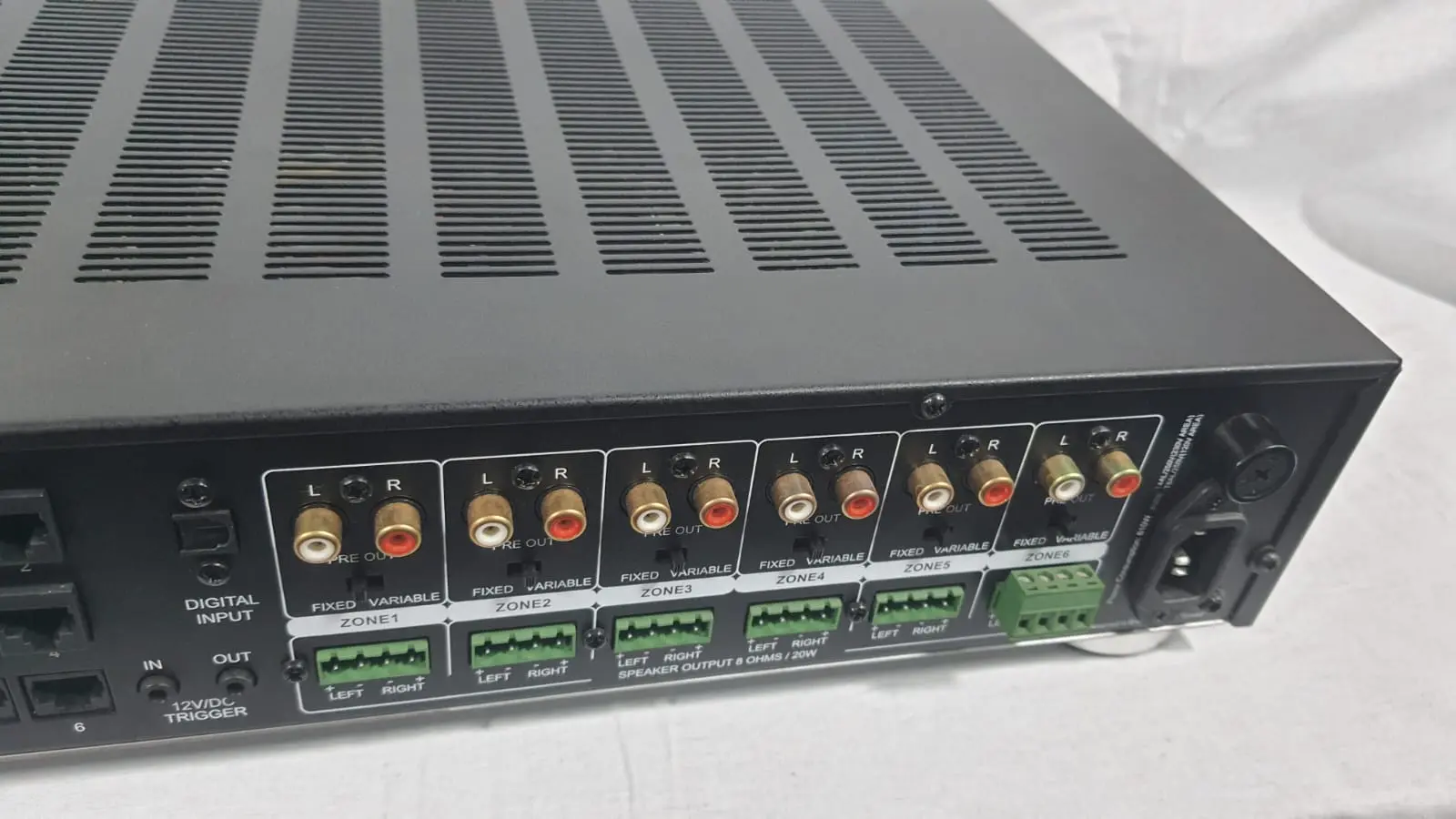 Possui 6 zonas independentes, 6 fontes de entrada (5 analógicas + 1 digital), amplificação digital de 12x20W RMS (8 Ohms) ou 12x35W RMS (4 Ohms) e saídas pré-amplificadas (preout) em todas as zonas, com suporte a automação.