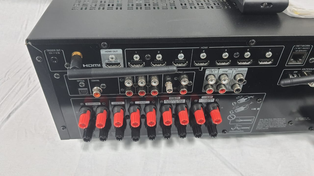 - Canais: 7.2 (suporta configuração 5.1.2 para Dolby Atmos com falantes de altura).